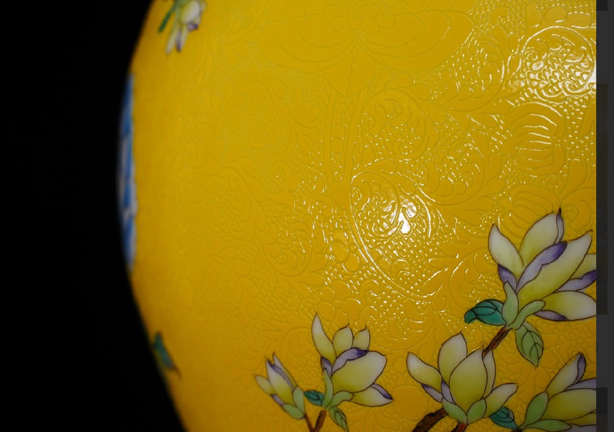 遠觀扒花瓷,是品不出其之妙處的,只覺花色繁複妍麗,甚是雍容清麗,需得近觀,在通光之下,瞬間脈路頓現,華光流韻,其工藝之妙,教人讚嘆不已。