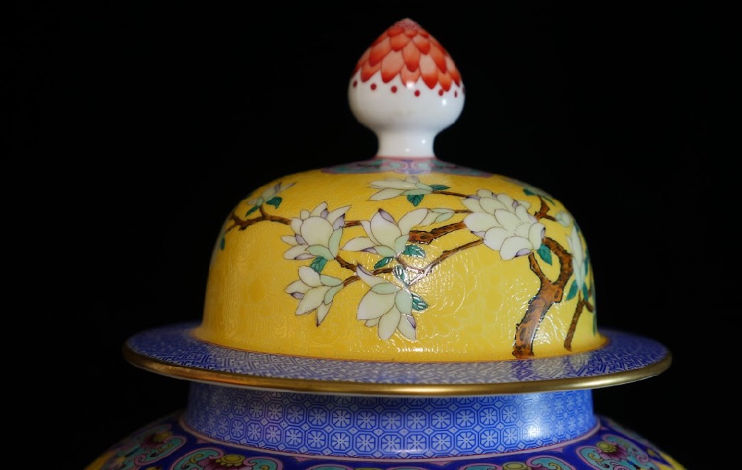 罐身為直口,豐肩,斂腹,平面砂底,附寶珠頂高圓蓋。康熙時期,是將軍罐廣為流行的時期,這時的造型,將渾圓的罐體展肩提腹,拉長頸部,收緊圈足,使得將軍罐的造型顯得挺拔向上,氣魄宏偉。