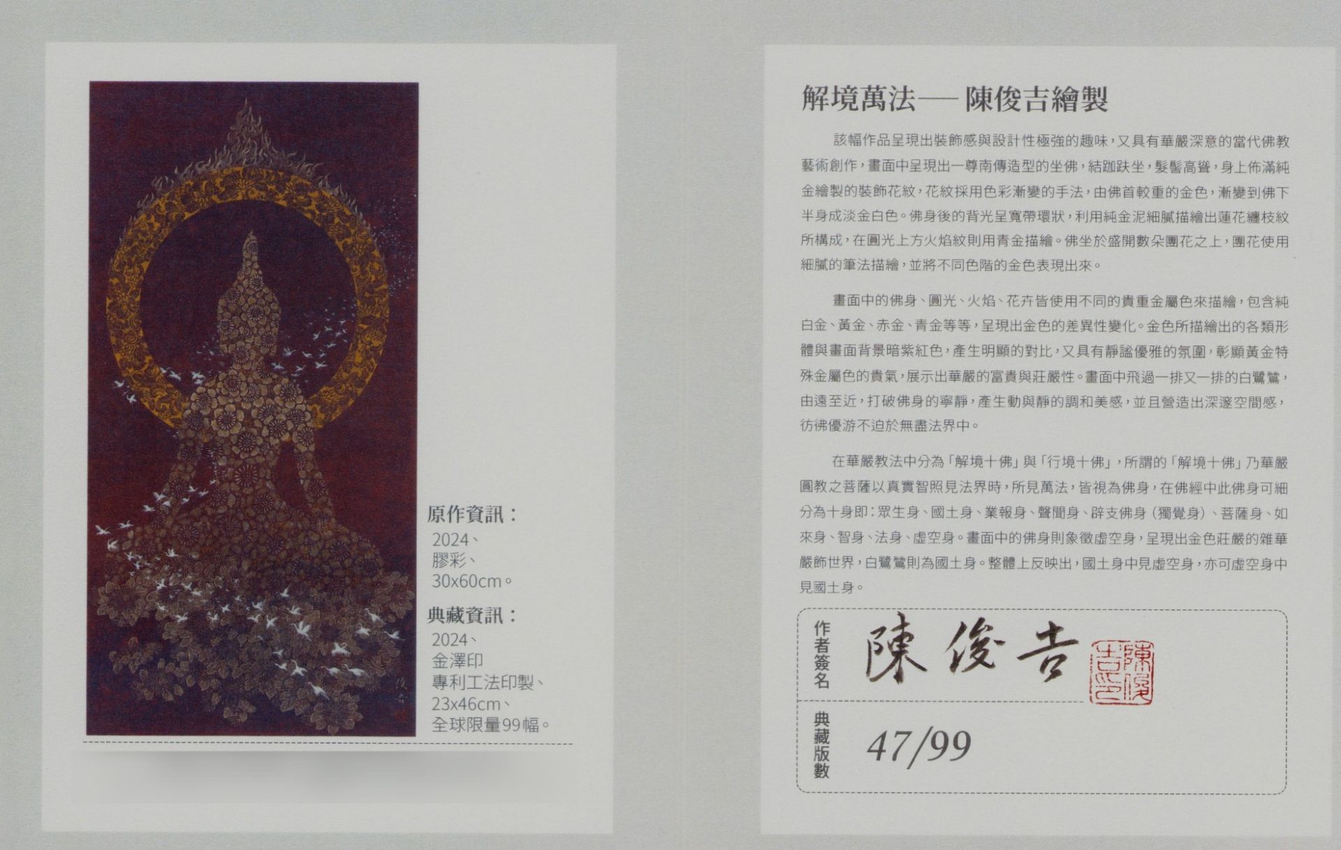 代表作《解境萬法》即以萬朵珍花構築佛身形輪廓,無數工筆仙鶴飛舞天際,象徵「花開見佛」、萬行成華的境界,畫面壯麗而不失細膩,充滿華嚴世界的象徵意涵。這種以萬物最美形象構築佛國淨土的創作方式,正體現出他對佛法世界的深刻感悟與詮釋能力。