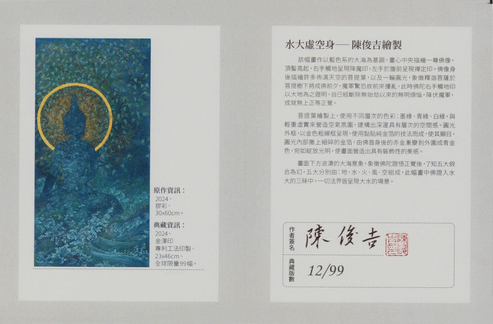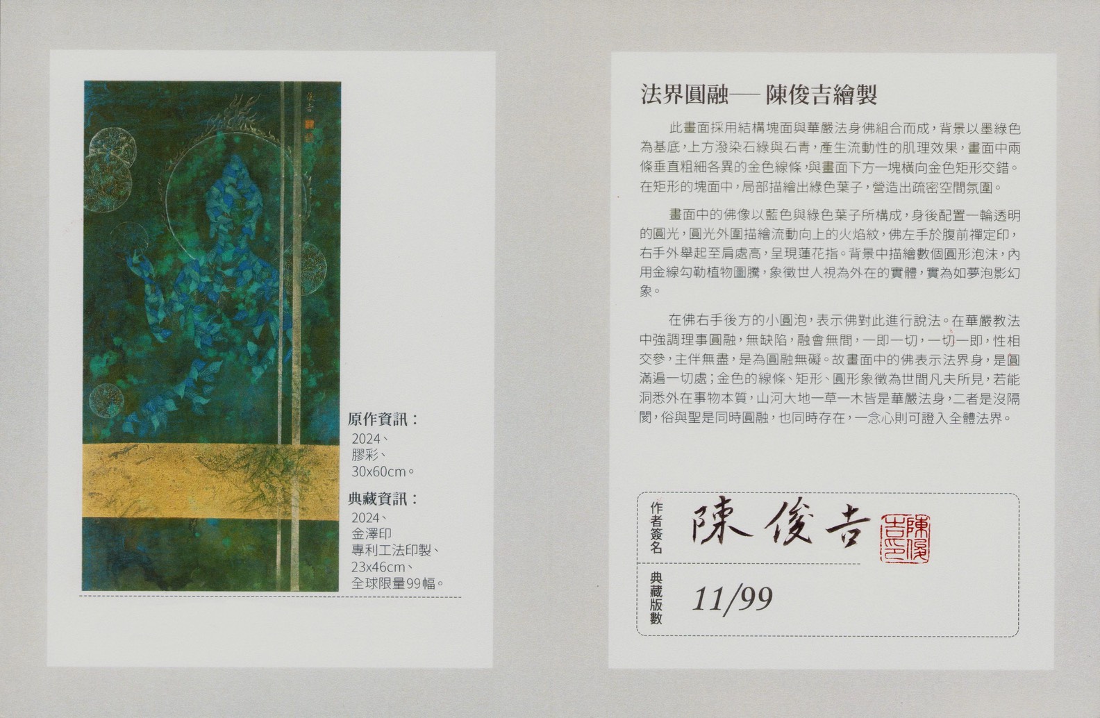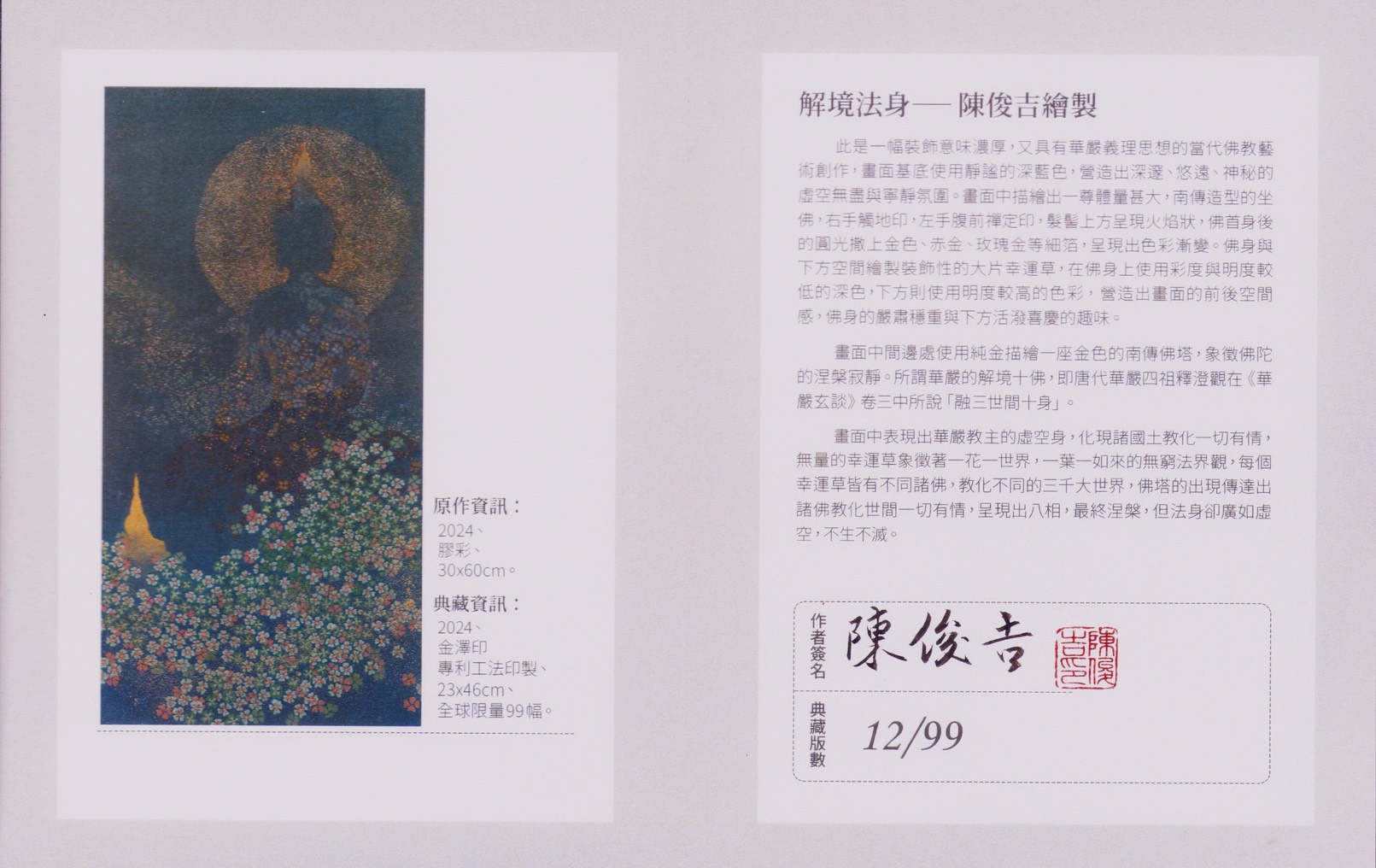 在這些作品中,觀者不僅能欣賞到東方繪畫的技藝精粹,更能從畫面中的色彩、紋理與構圖中,感受到佛教世界的莊嚴、和諧與智慧。對陳俊吉而言,「畫佛即是修行」,而對觀者而言,欣賞他的畫,也是一場靜心、悟道的美學體驗。