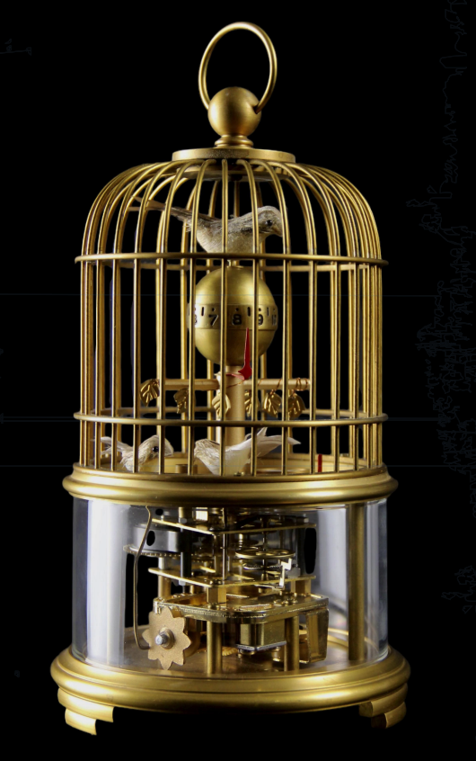 這是故宮所藏機械玩具中的一個主要品種,在清代提籠架鳥是當時社會的娛樂方式之一。為了迎合這種風尚,歐洲鐘錶制造商向中國輸入了鳥音籠這一機械玩具,在宮廷中被作為新奇的陳設品。